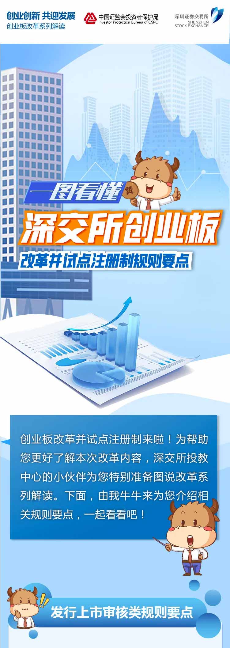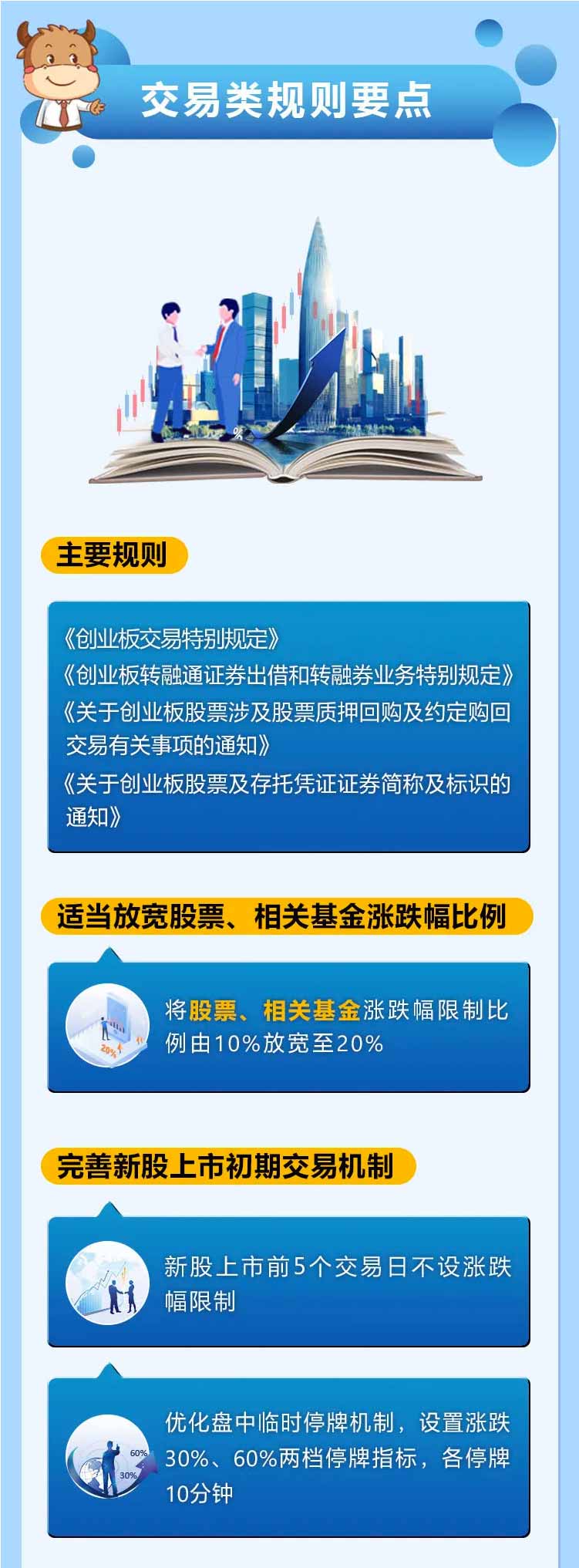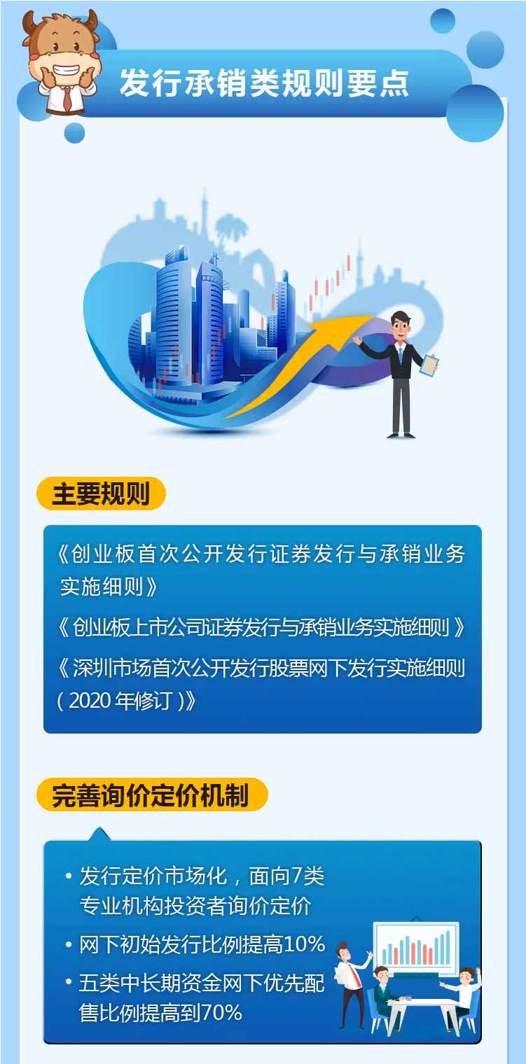 為幫助投資者加深對創業板改革并試點注冊制的認識和理解,深交所投資者教育中心特別推出圖說改革系列解讀。本篇介紹上市審核類、發行承銷類、交易類、持續監管類主要規則及要點,一起來了解一下吧!